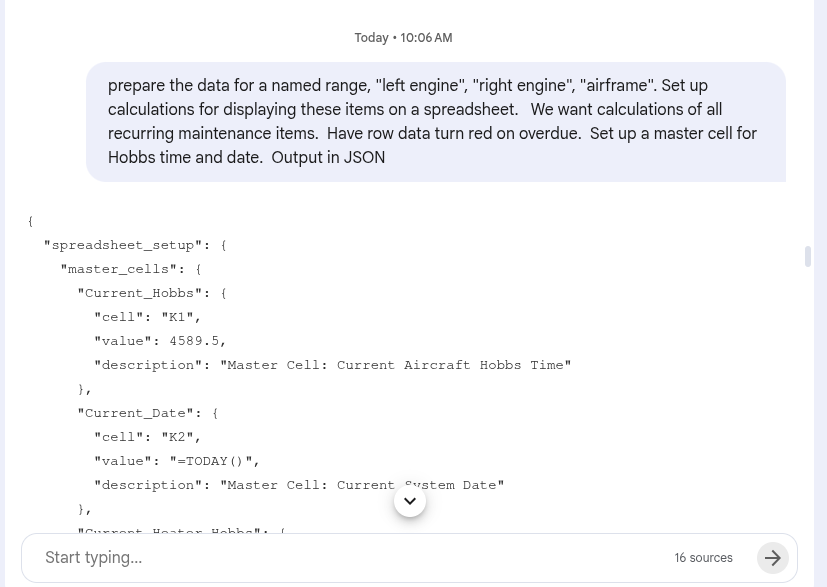 Ok so I paste my JSON data into the chat window of an OpenAI and ask for a spreadsheet to track aircraft maintenance. I asked for a set of cells in the upper left hand portion of the spreadsheet to enter the Hobbs time and date. It knows how to handle the items either by Hobbs time or calendar time.